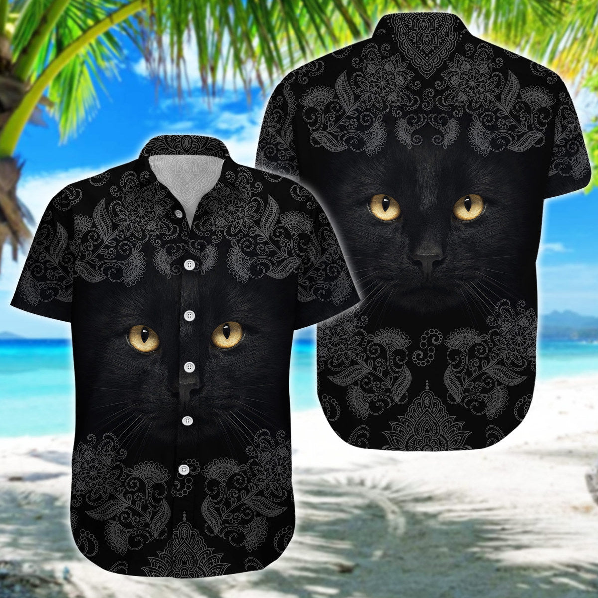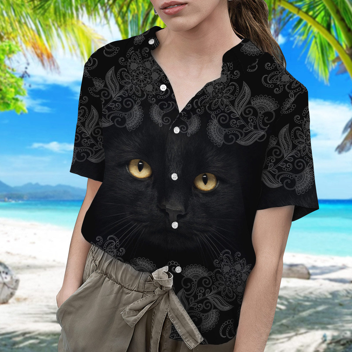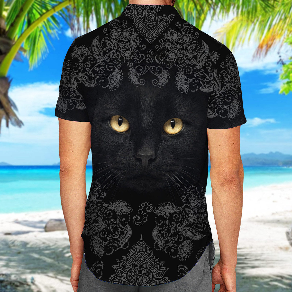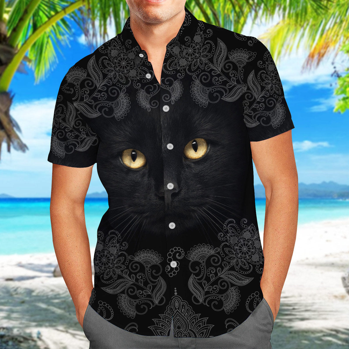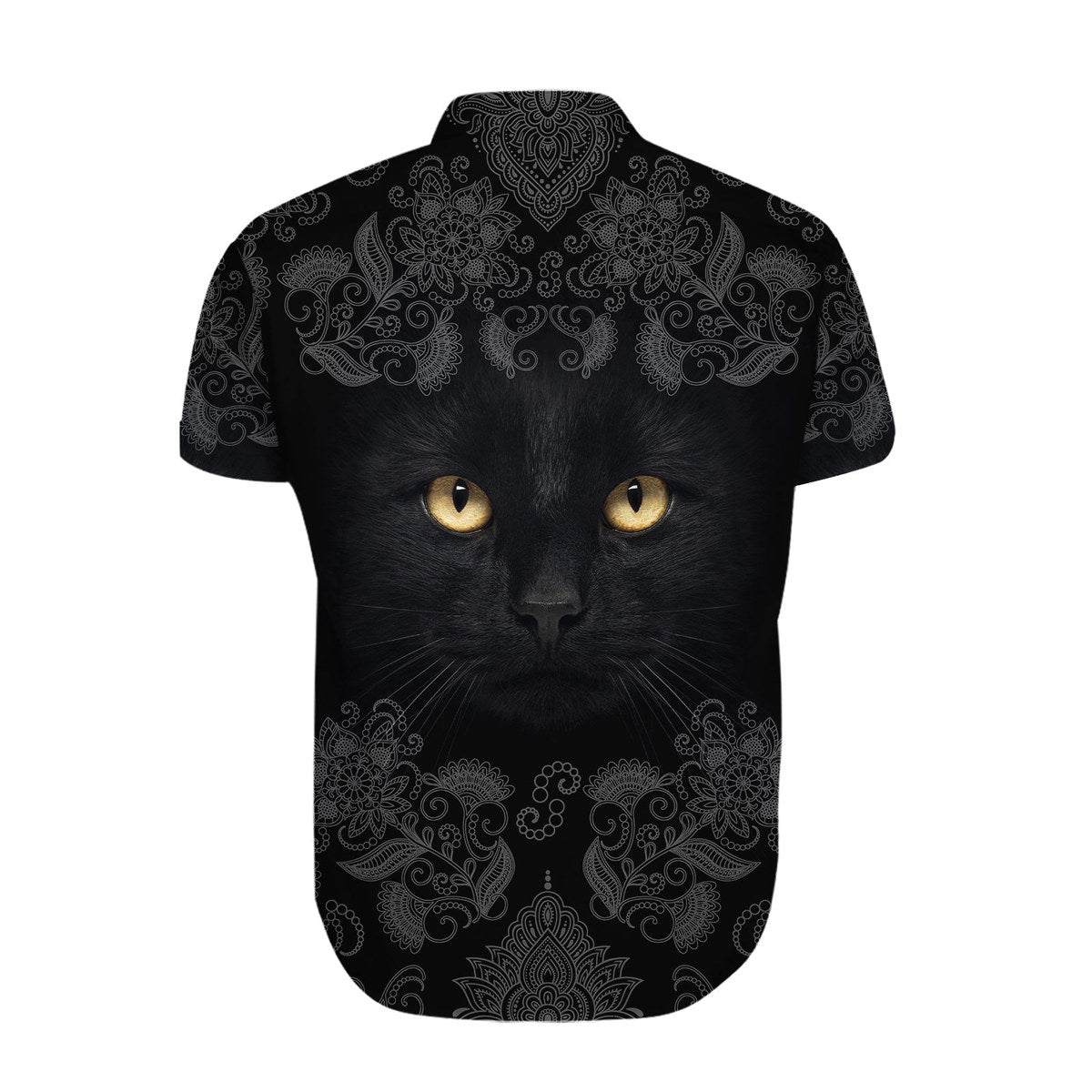 Black Cat Floral Pattern Casual Button-Down Shirts Short Sleeve, Tropical Hawaiian Shirt, Cat Lover Gifts, Daily Outfit