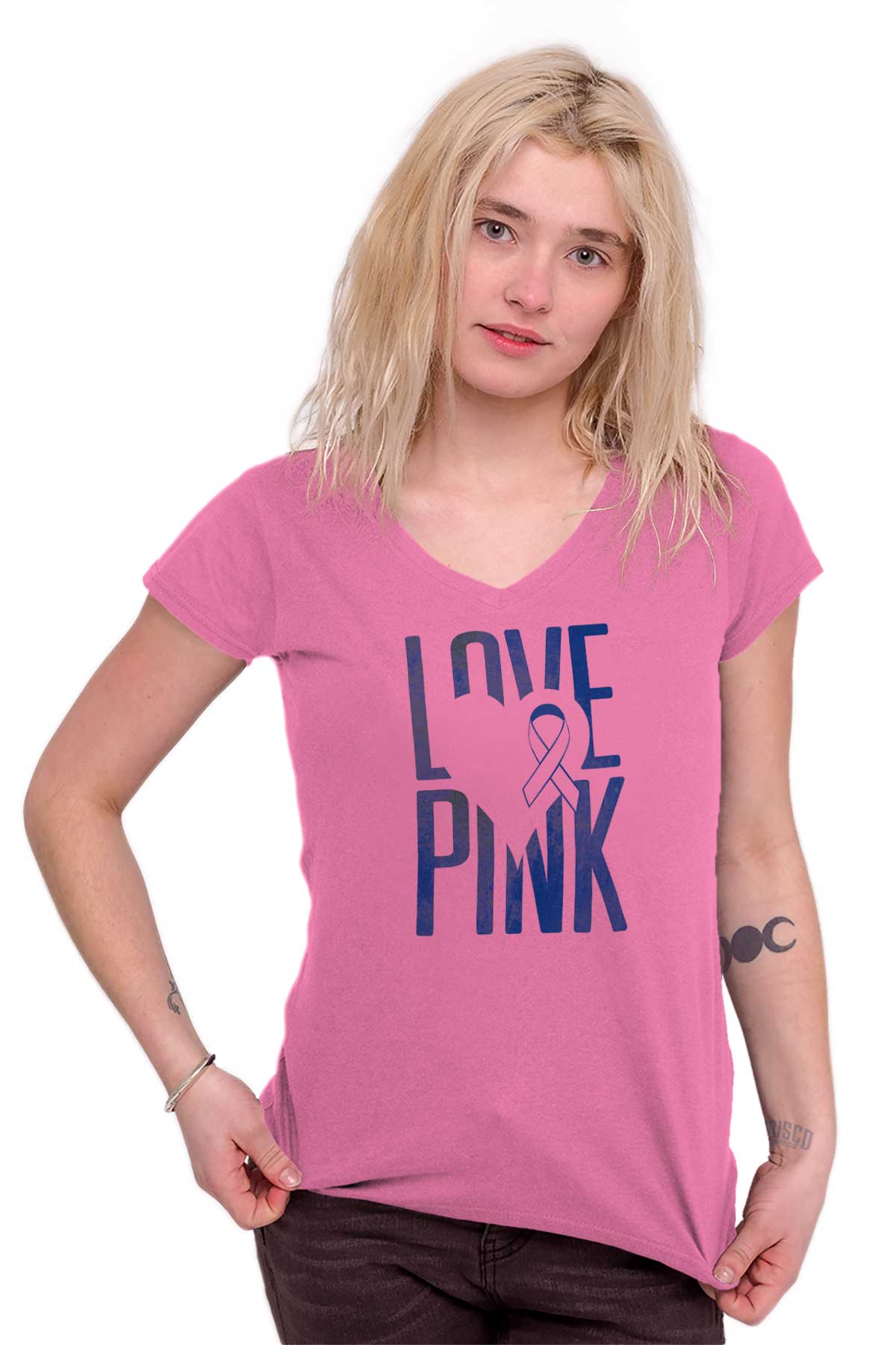 Breast Cancer Awareness Love And Pink Junior V-Neck Tee