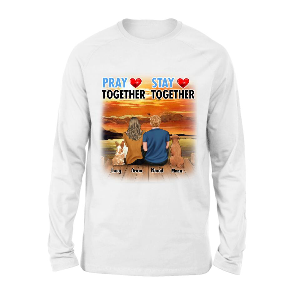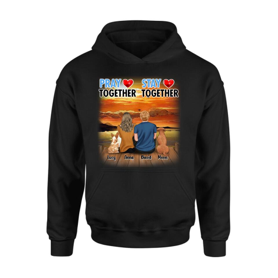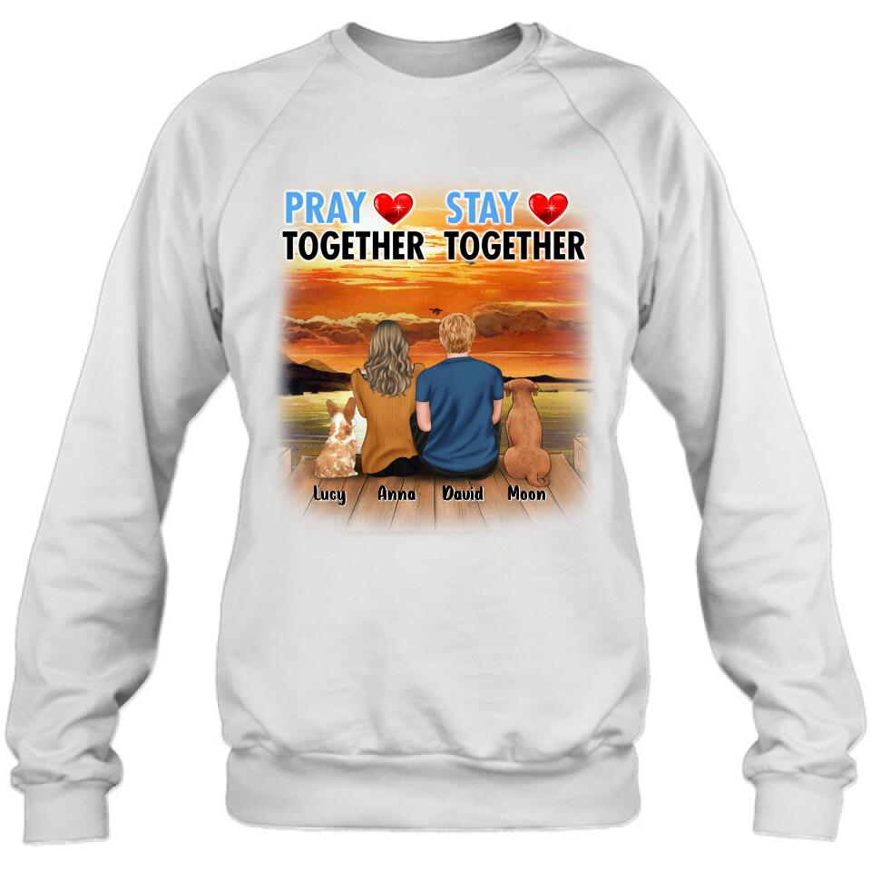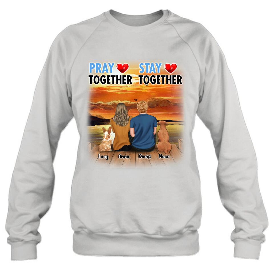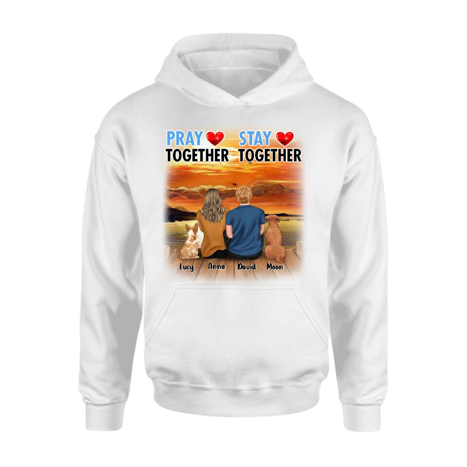 Custom Personalized Couple With Pet Shirt/ Pullover Hoodie – Couple With Upto 2 Pets – Gift Idea For Dog/Cat Lover – Pray Together Stay Together