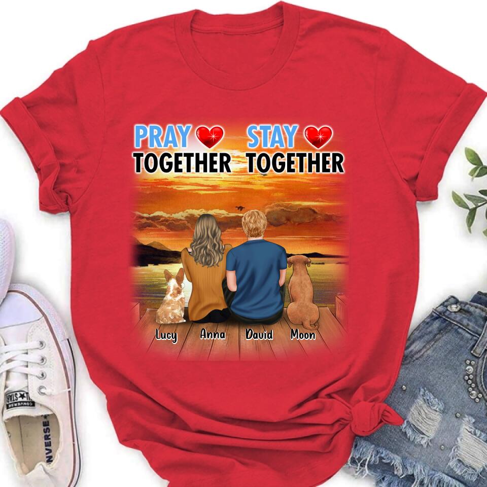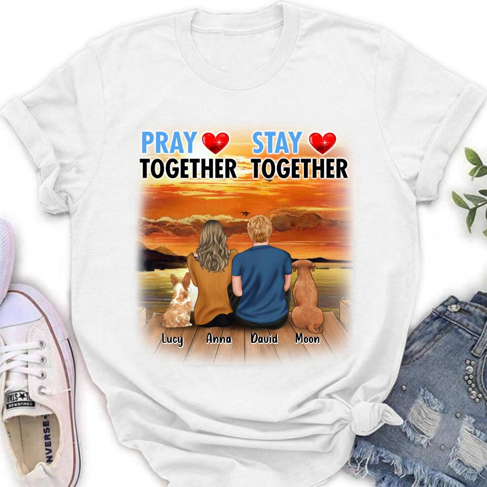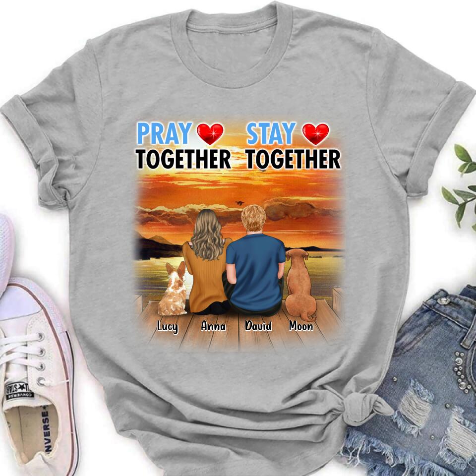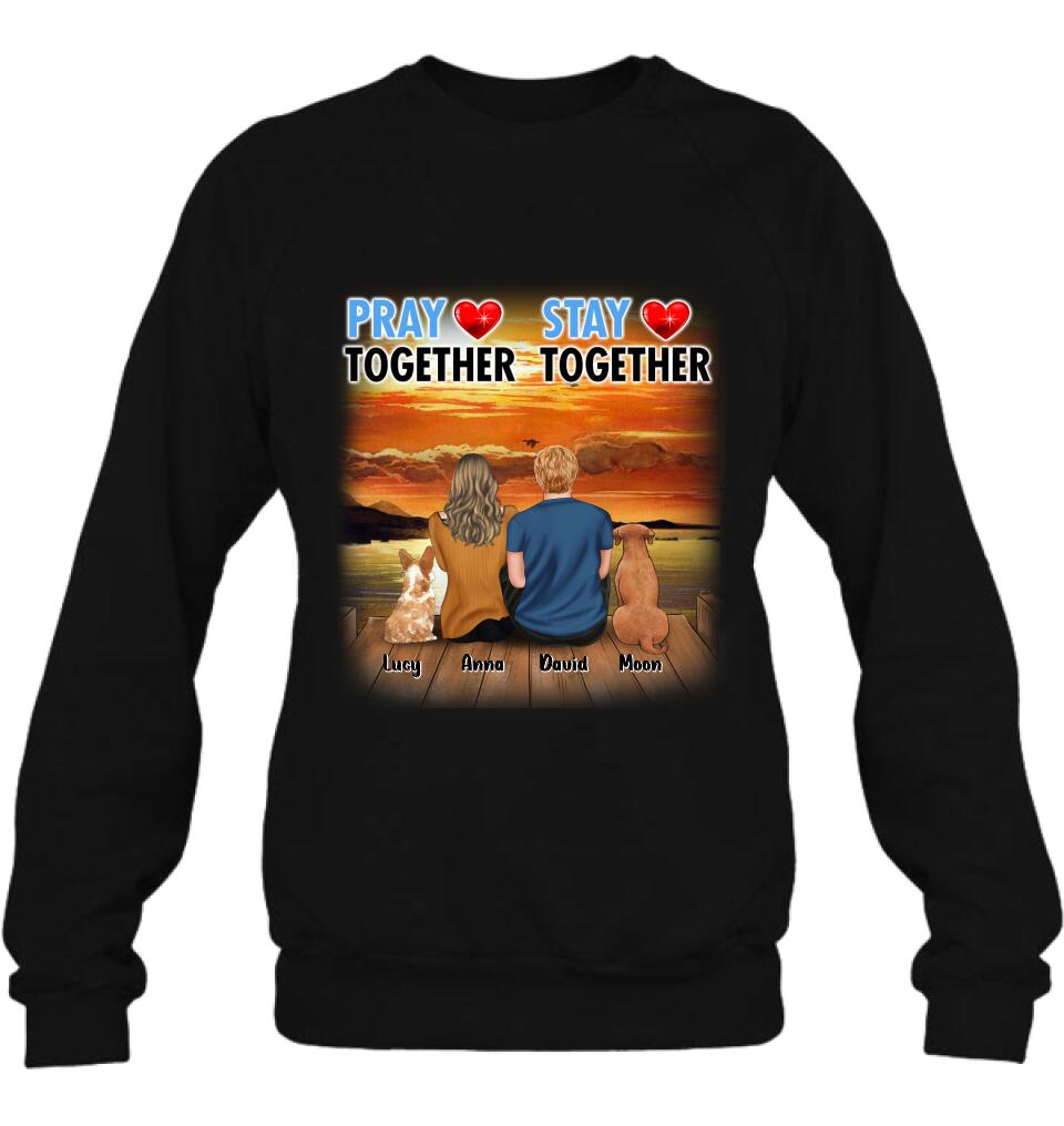 Custom Personalized Couple With Pet Shirt/ Pullover Hoodie – Couple With Upto 2 Pets – Gift Idea For Dog/Cat Lover – Pray Together Stay Together