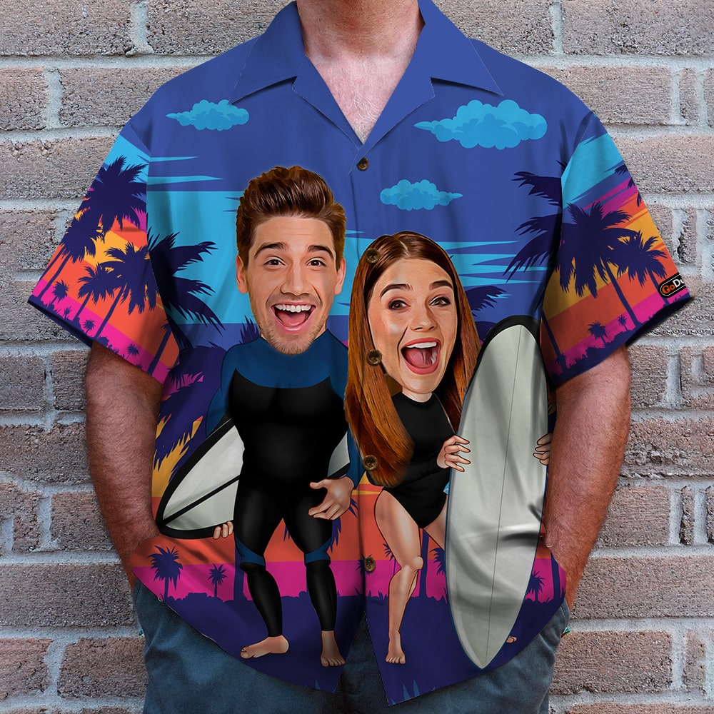 Custom Surfing Couple Hawaiian Shirt And Men Beach Shorts, Sunset Pattern
