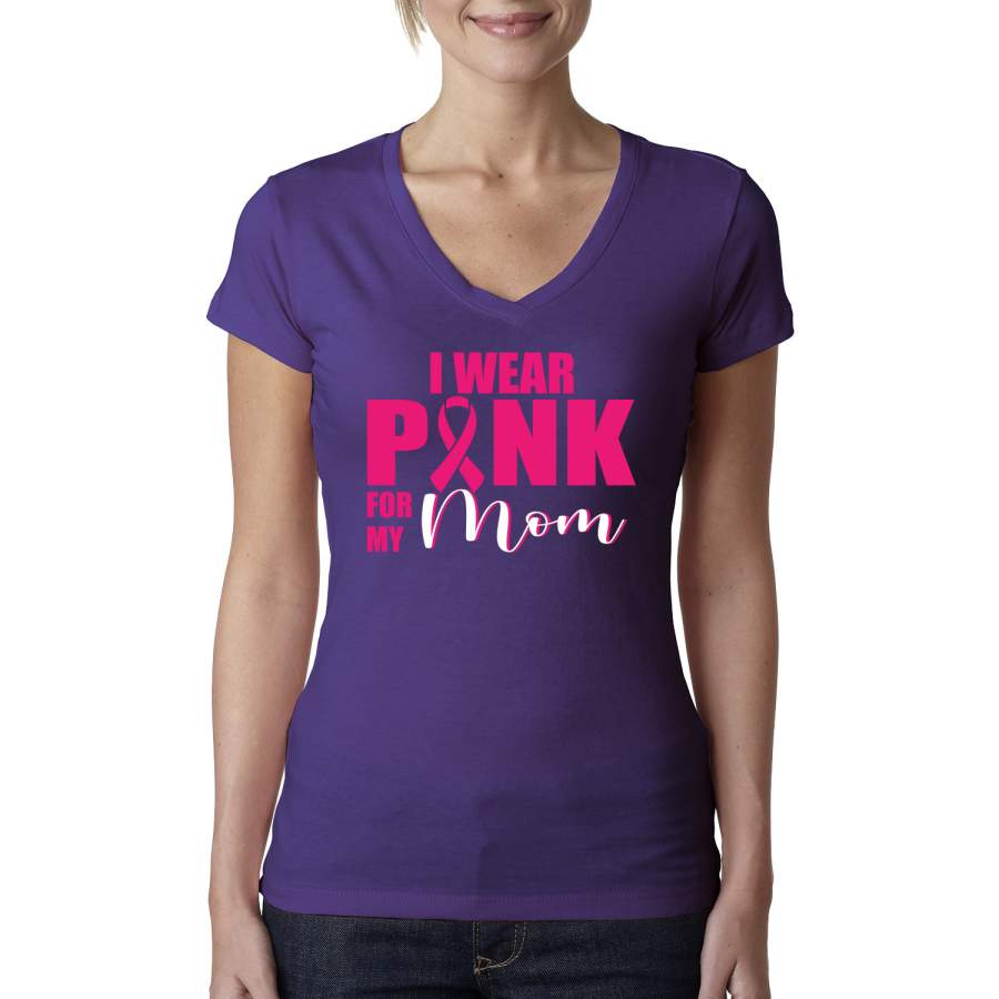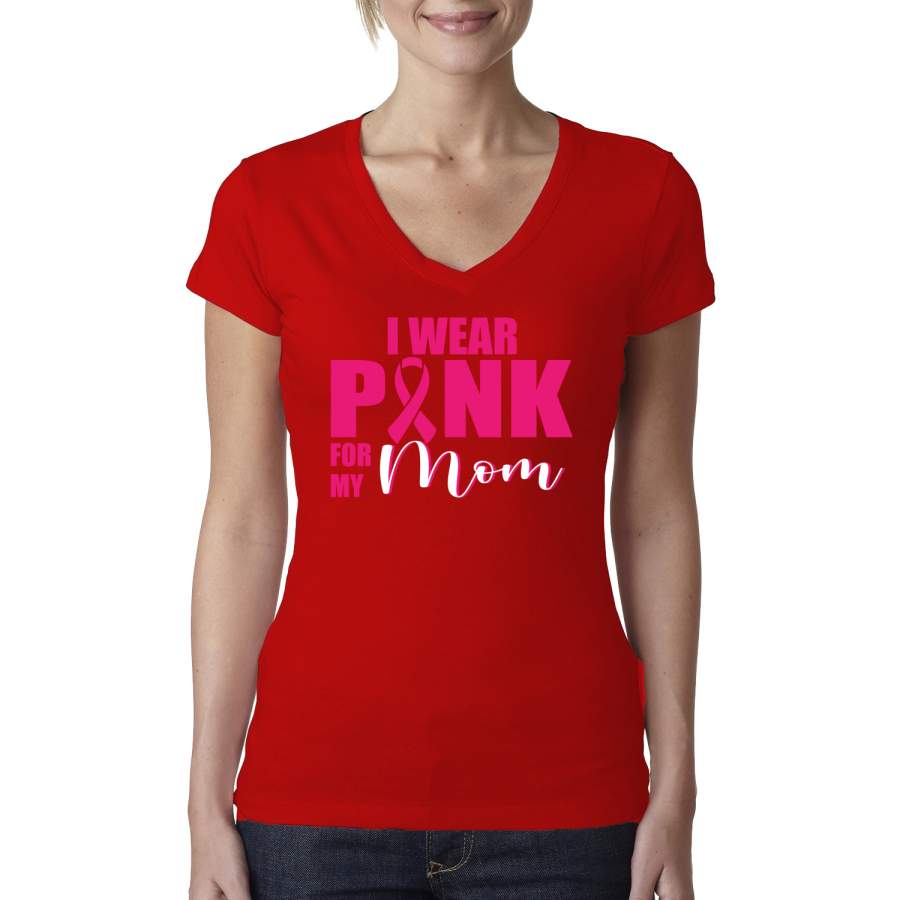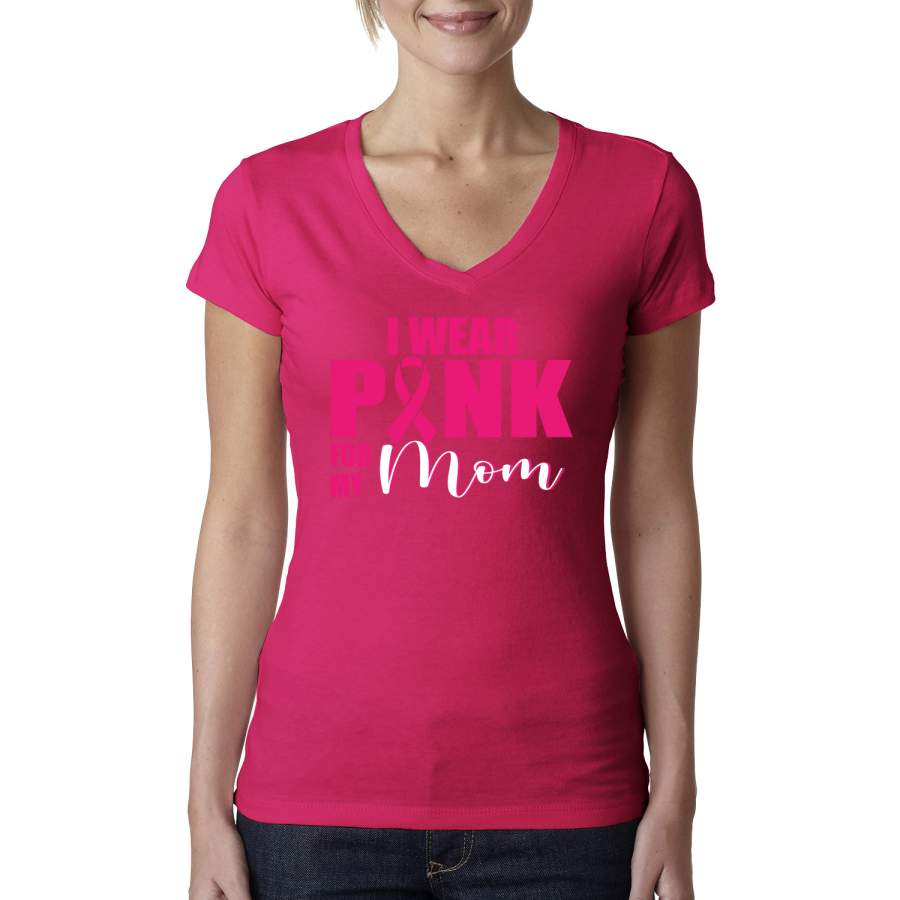 I Wear Pink for My Mom Survivor Breast Cancer Awareness Womens Junior Fit V-Neck Tee