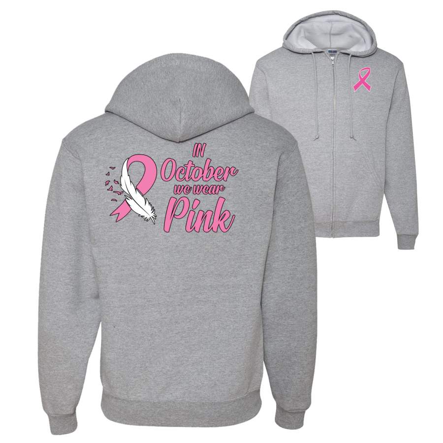 In October We Wear Pink Breast Cancer Awareness Front and Back Graphic Zip Up Hoodie Sweatshirt