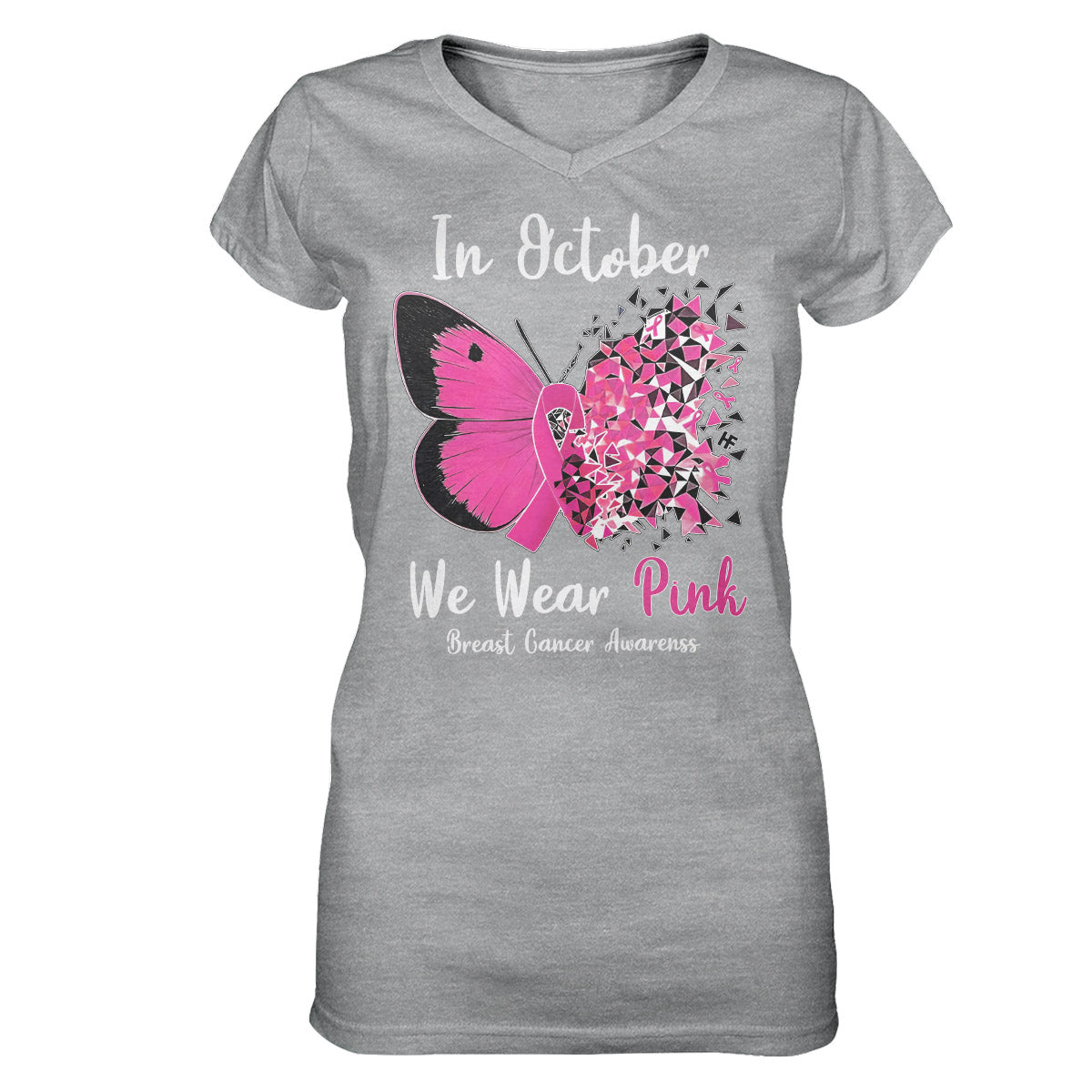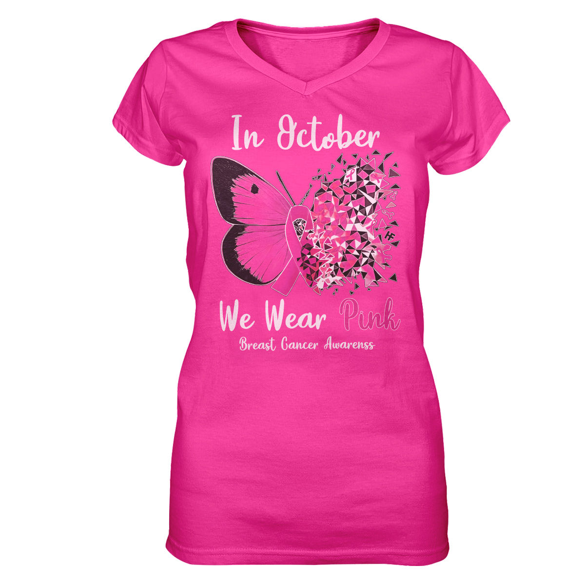 In October We Wear Pink Butterfly Breast Cancer Awareness Shirt, Breast Cancer Month Women V-Neck T-Shirt