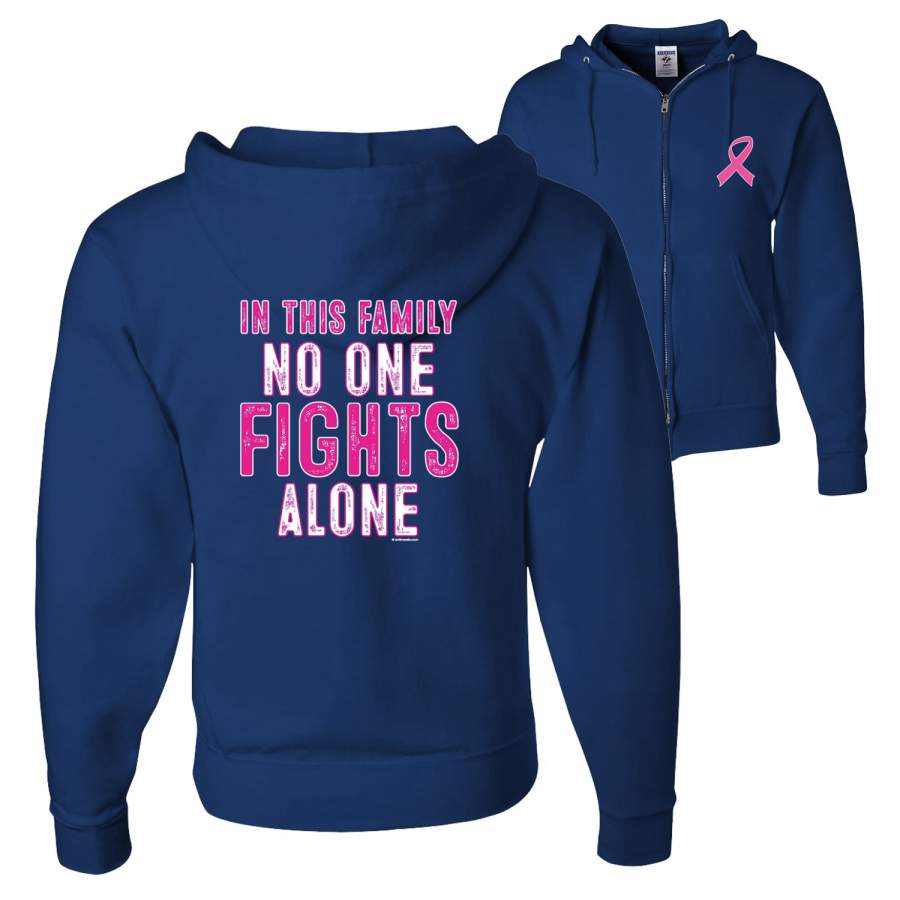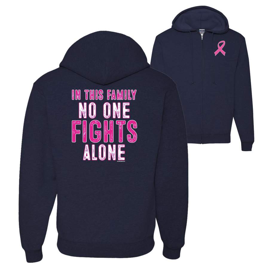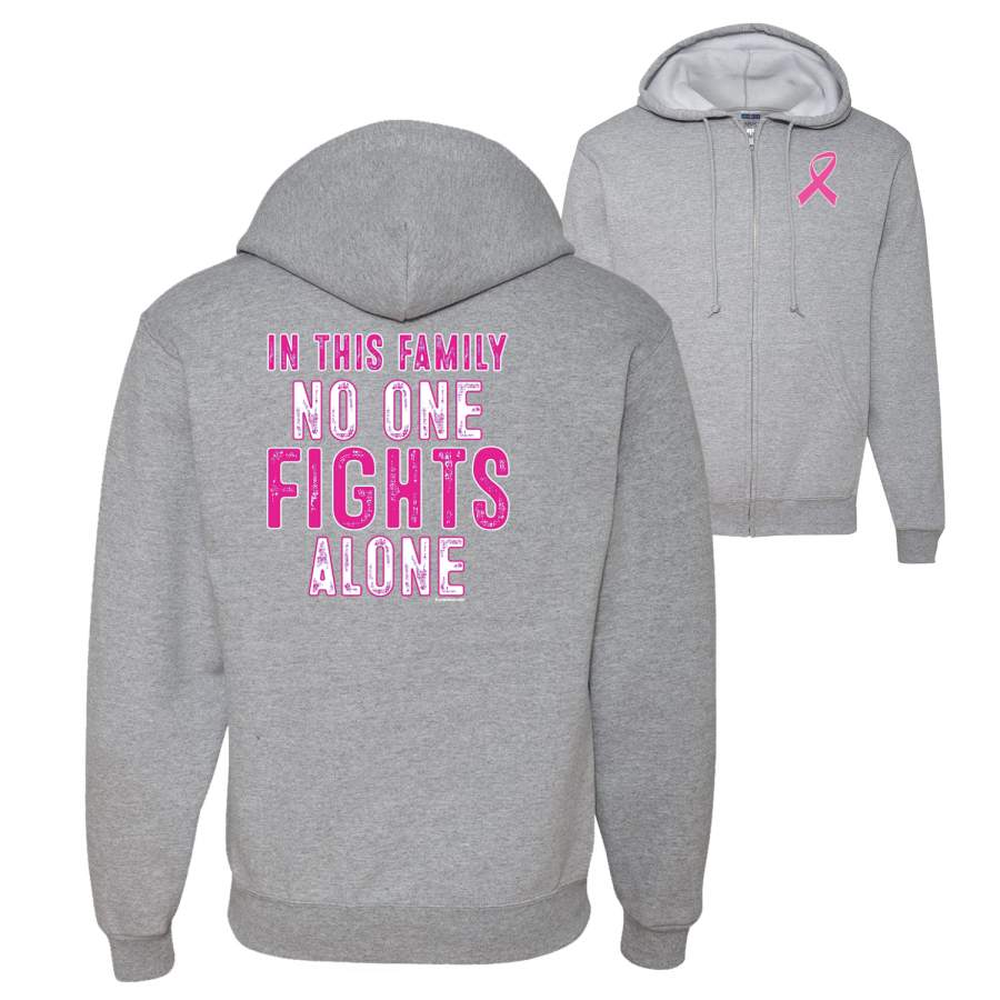 In This Family No One Fights Alone Breast Cancer Awareness Front and Back Graphic Zip Up Hoodie Sweatshirt