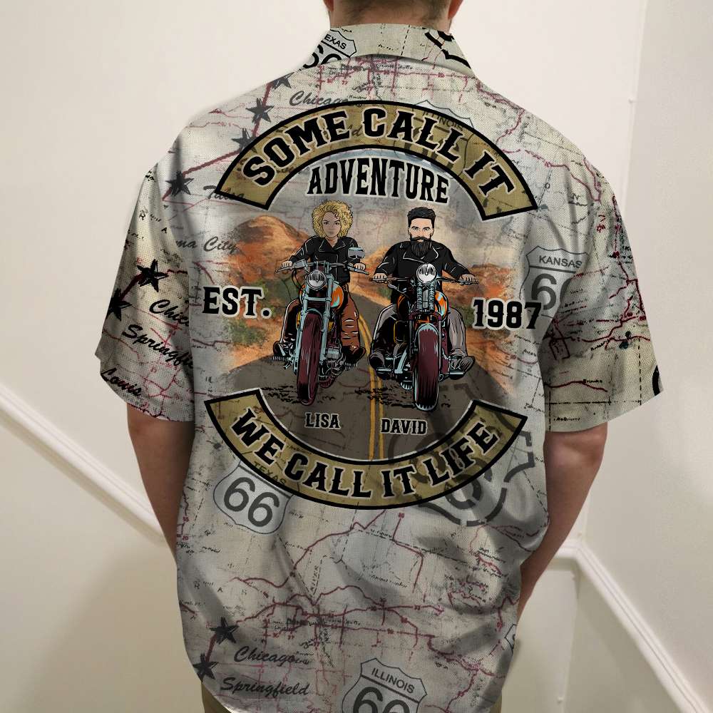 Personalized Biker Couple Hawaiian Shirt – Some Call It Adventure We Call It Life – Palm Tree Pattern