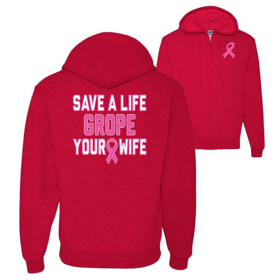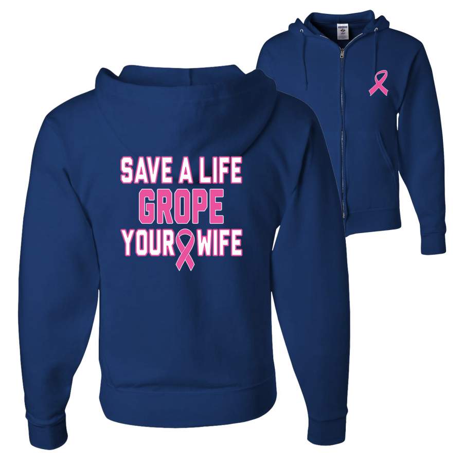 Save a Life Grope Your Wife Breast Cancer Awareness Front and Back Graphic Zip Up Hoodie Sweatshirt