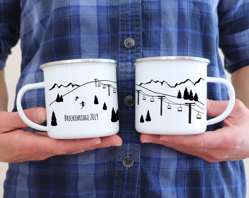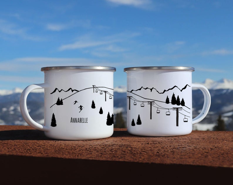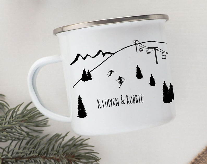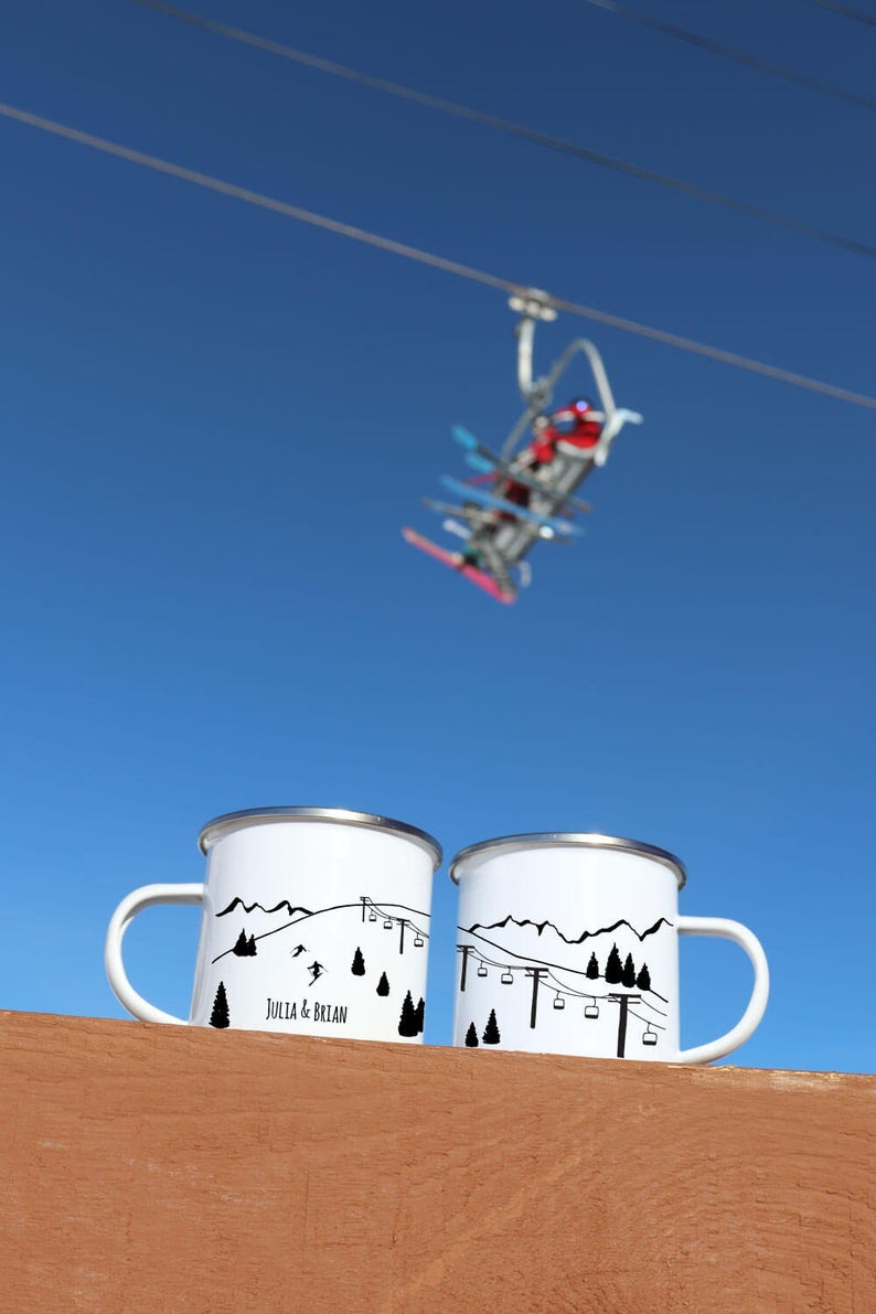 Ski Lift Camp Mug, Anniversary Gift Tin, Ski Mug, Travel Lover Gift Camping Gear, Campfire Mugs Ski Gifts, Custom Ski Couple Enamel Mug