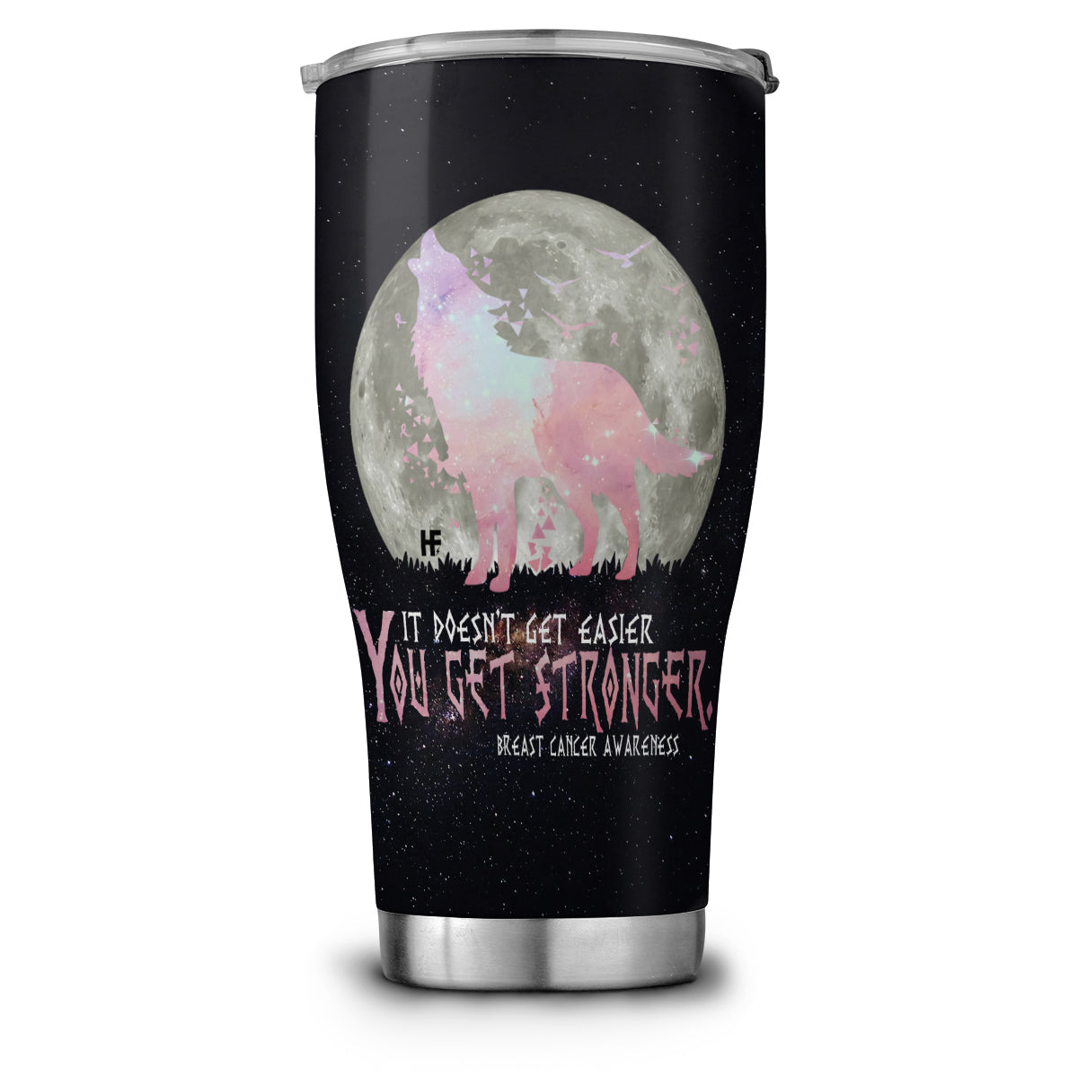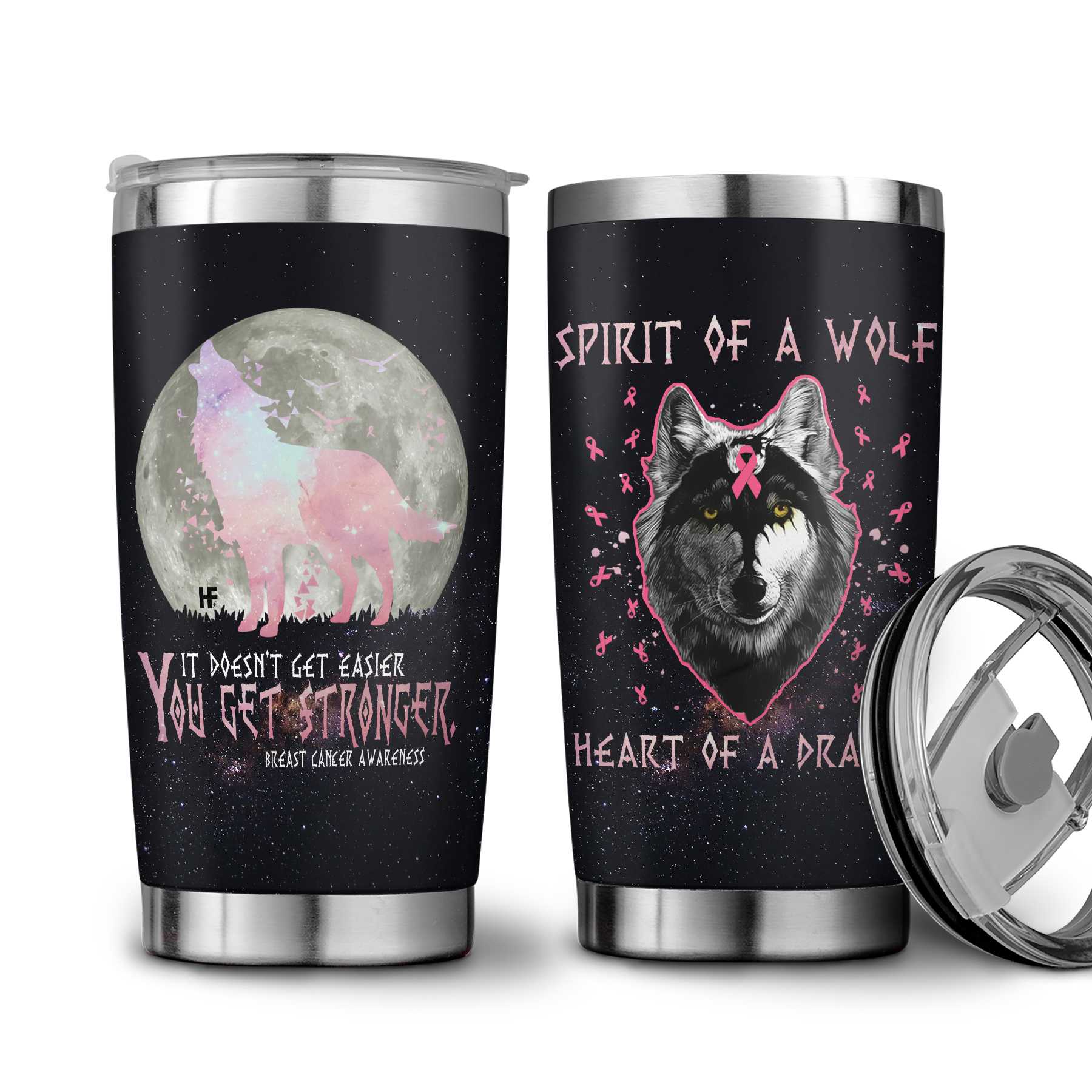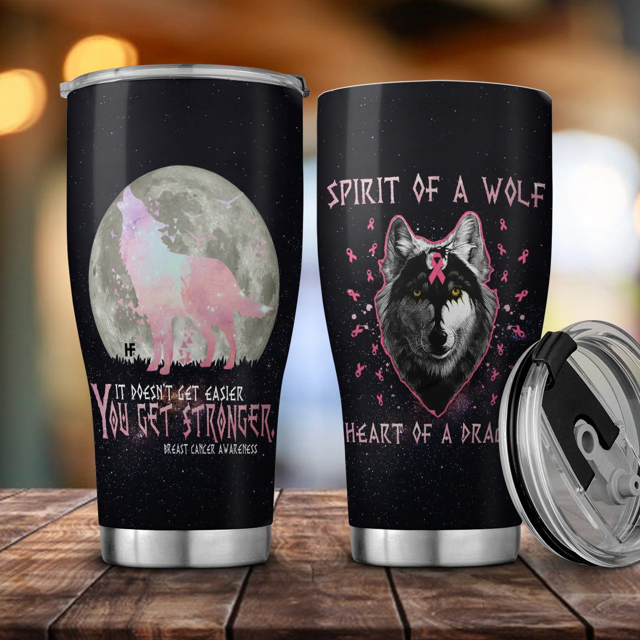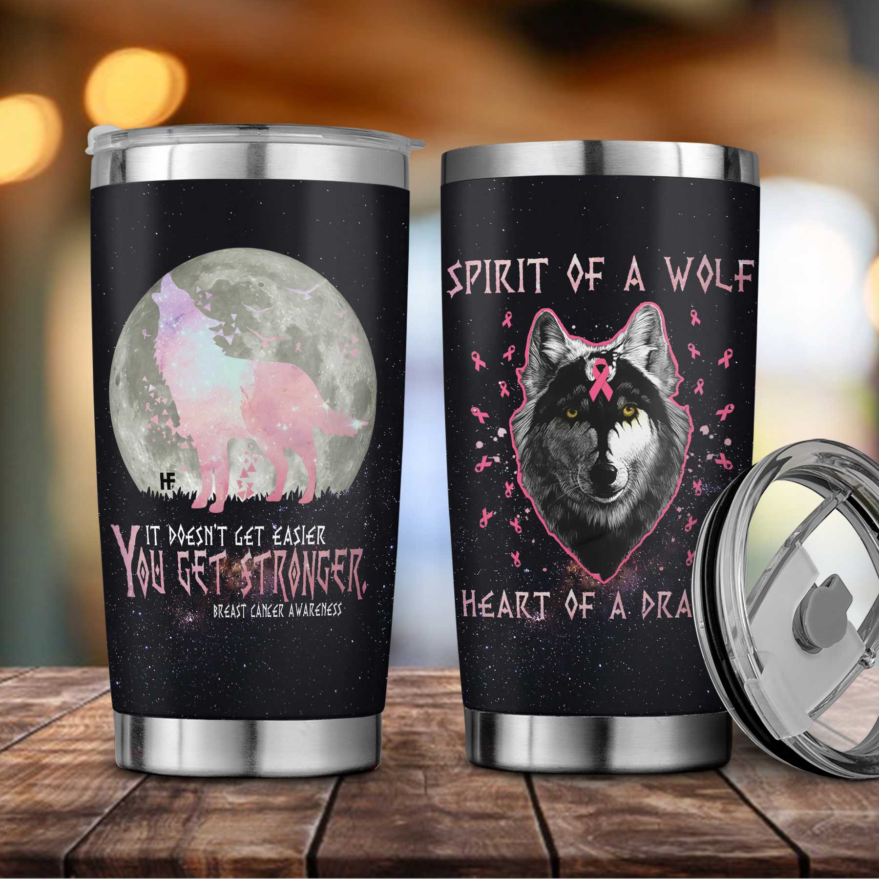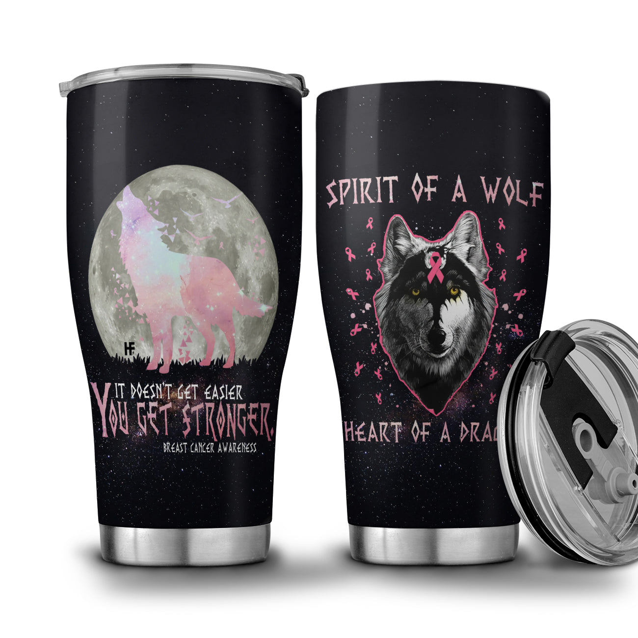 Spirit Of A Wolf Heart Of A Dragon Breast Cancer Awareness Stainless Steel Tumbler, Howling Wolf Cup With Lid