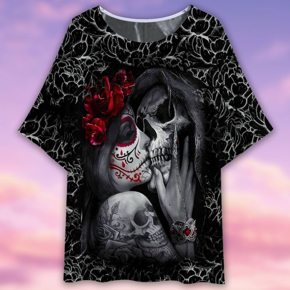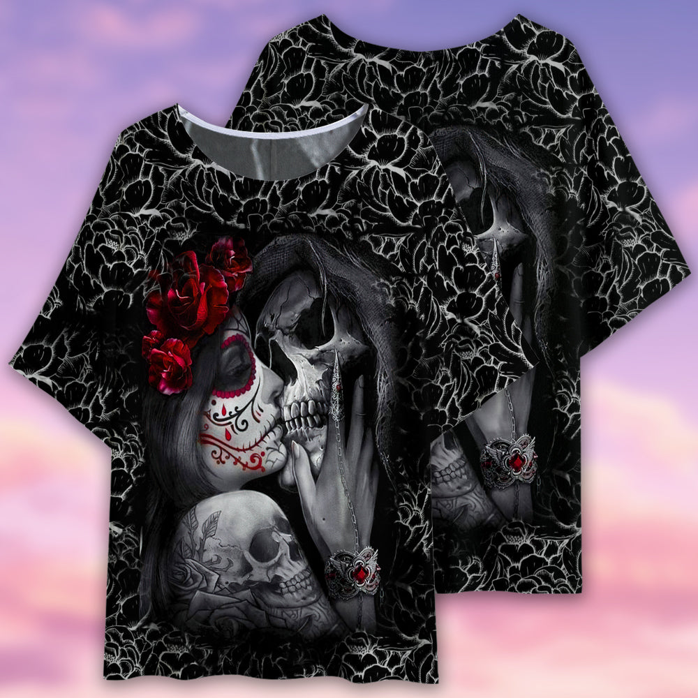 Sugar Skull Couple Rose Tattoo Pattern – Women’S T-Shirt With Bat Sleeve