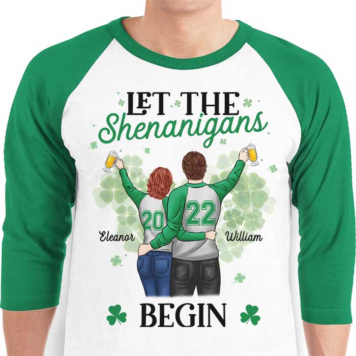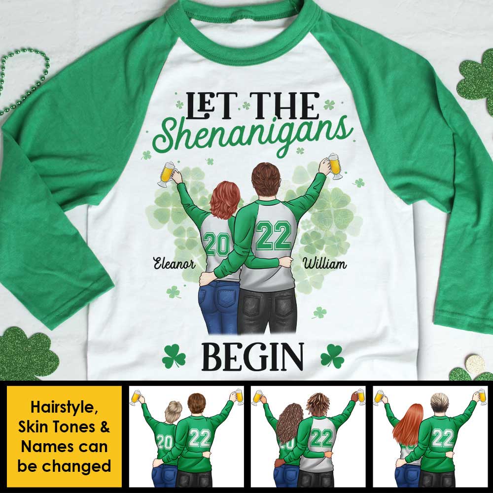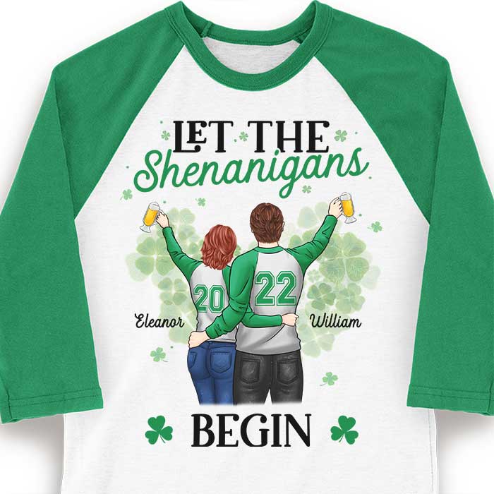 The Shenanigans Will Begin – Gift For Couples, Husband Wife, Personalized St. Patrick’S Day Unisex Raglan Shirt